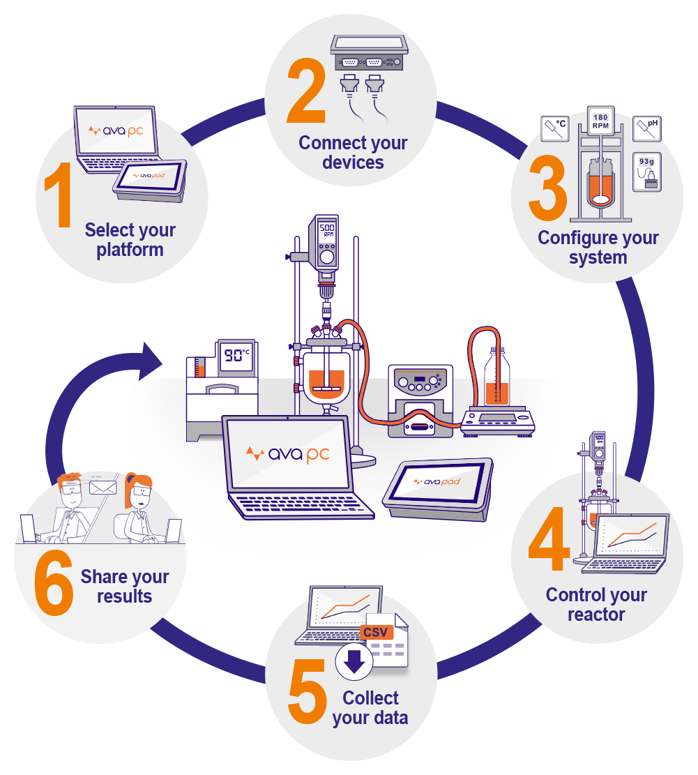 與AVA系統(tǒng)協(xié)作非常簡(jiǎn)單 只需6個(gè)步驟: 1. 選擇您的平臺(tái) 2. 連接您的設(shè)備 3. 配置您的系統(tǒng) 4. 控制反應(yīng)釜 5. 管理數(shù)據(jù) 6. 共享結(jié)果 |